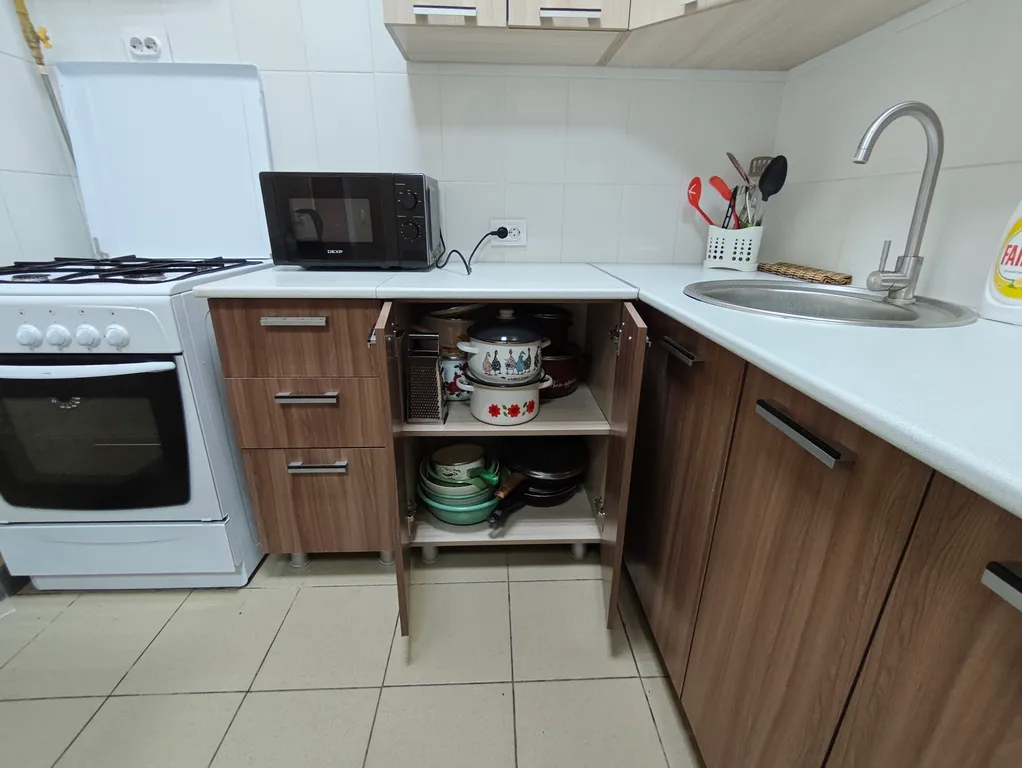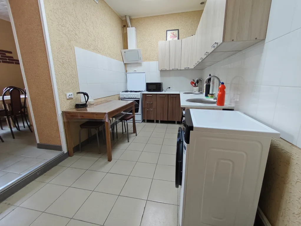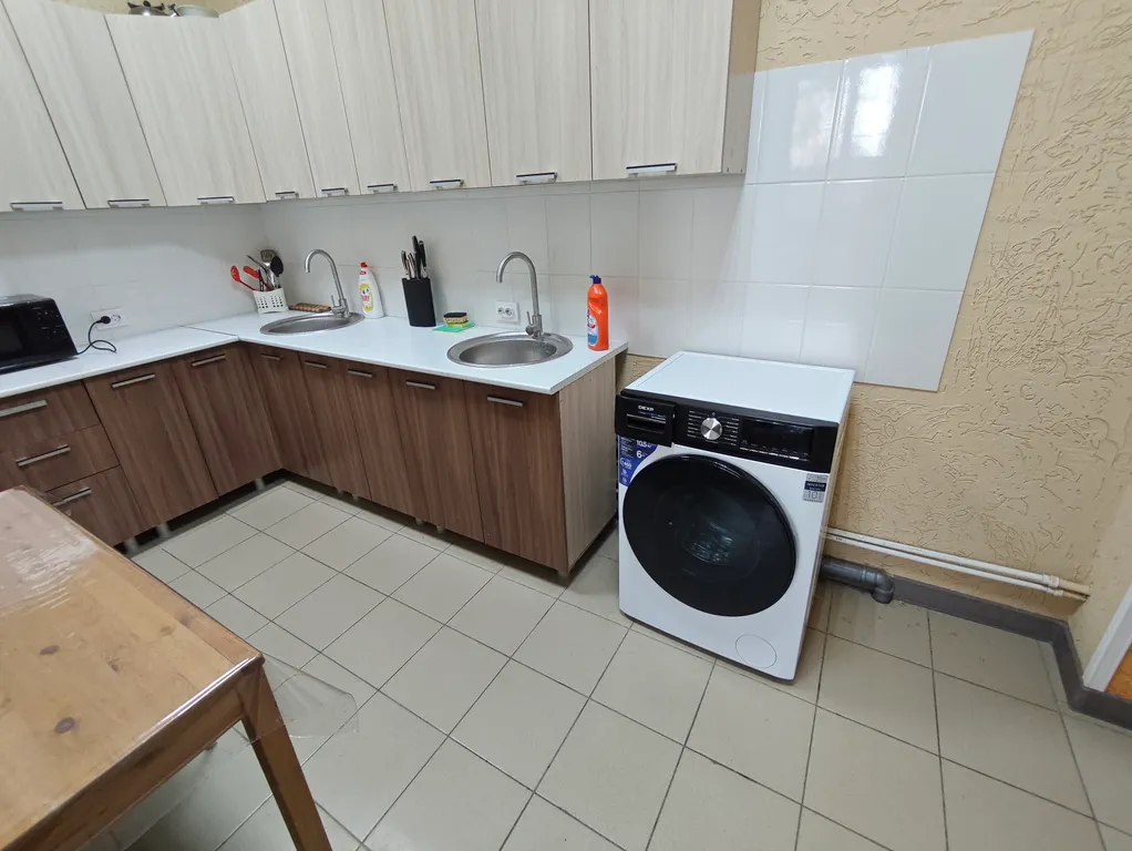 кухня со всем необходимым (кастрюли, сковородки, посуда), стирально-сушильные машины,
