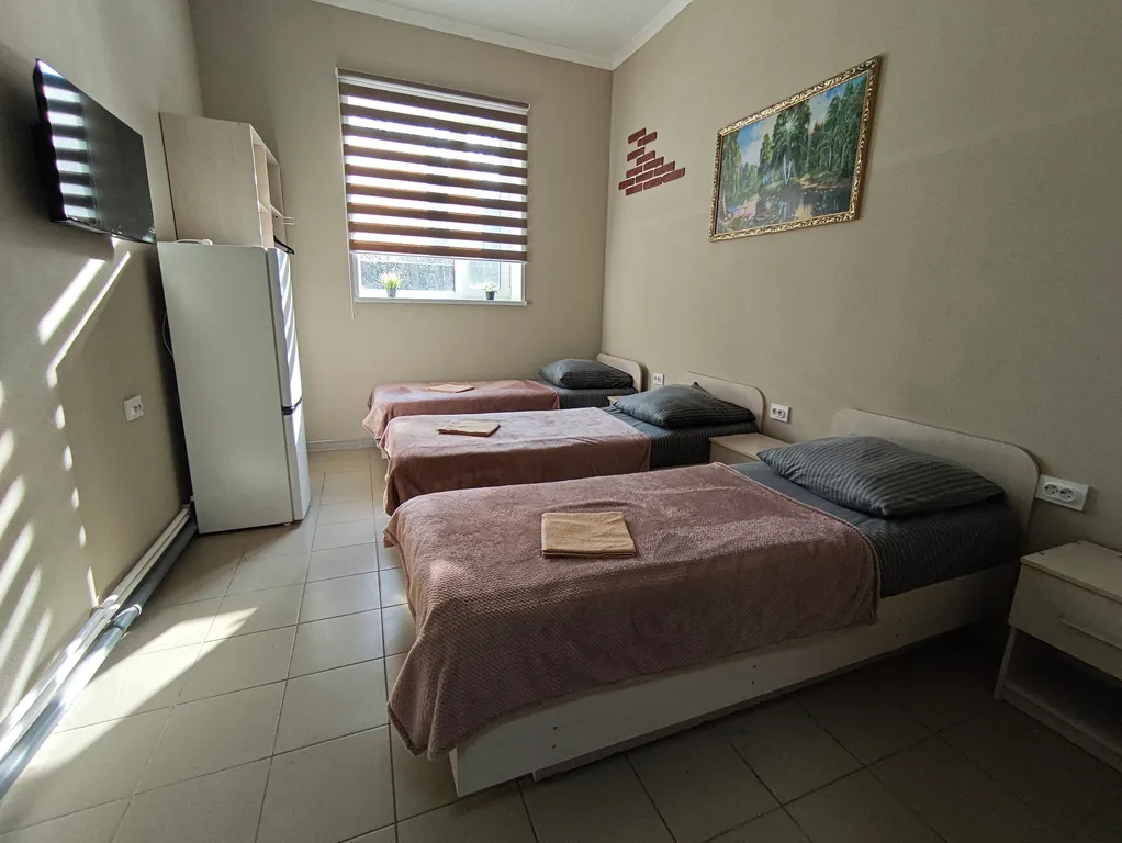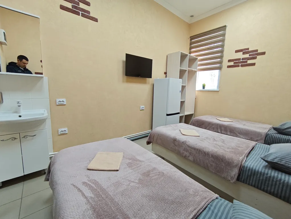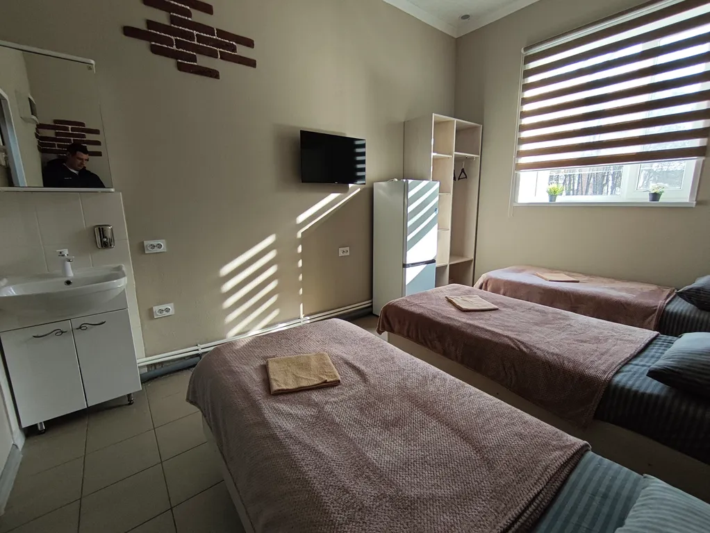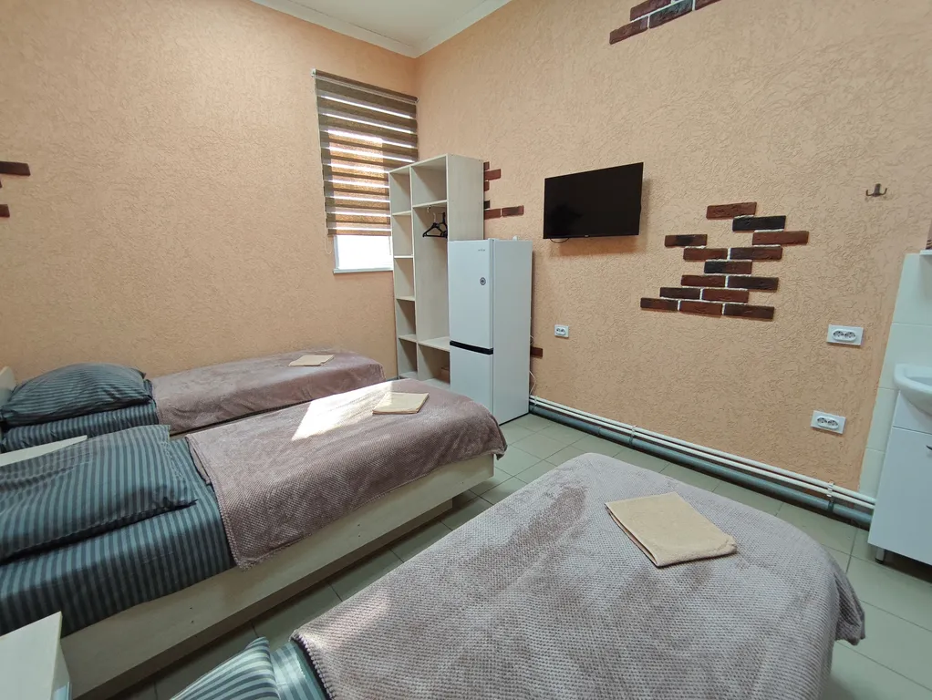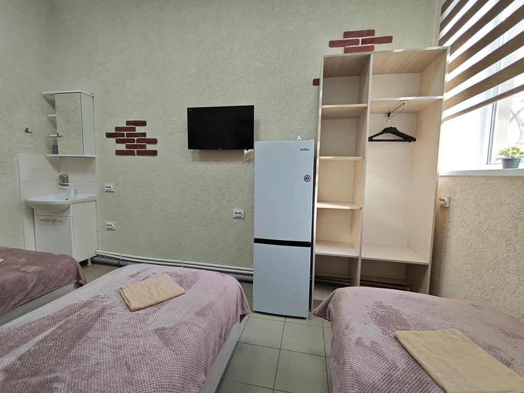 в каждом номере свой холодильник, смарт-ТВ, шкаф для одежды, умывальник, кровать, тумбочка.